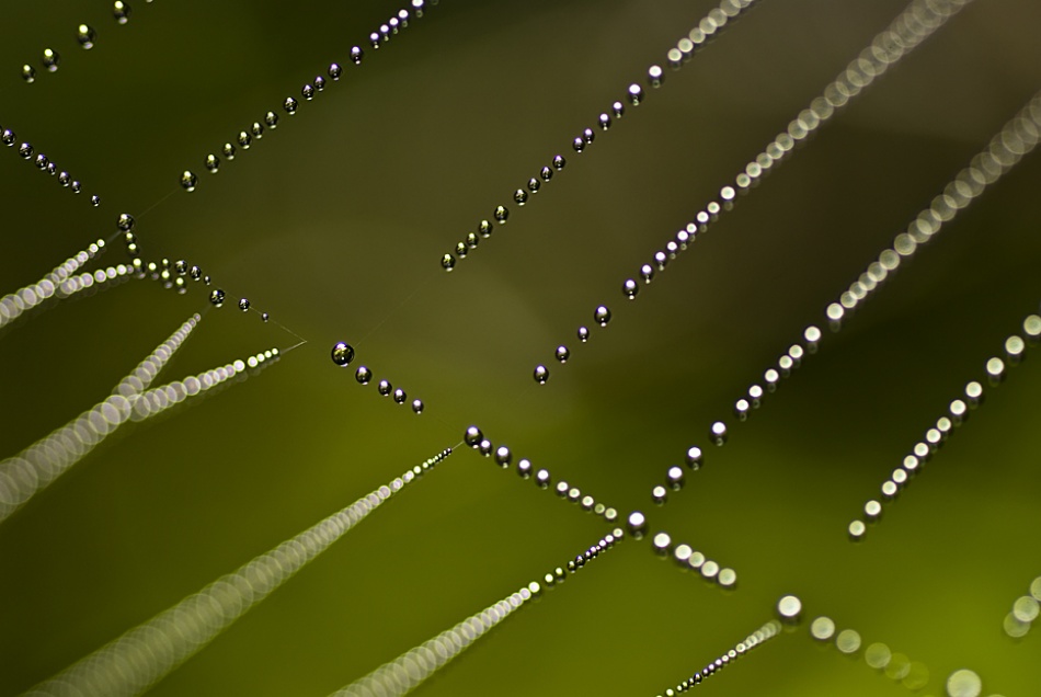 Dewdrops are fascinating subjects for macro photography. They give an immediate feeling of freshness and their perfect shape attracts the eye. The spider was not home, but the beauty of this web was striking.