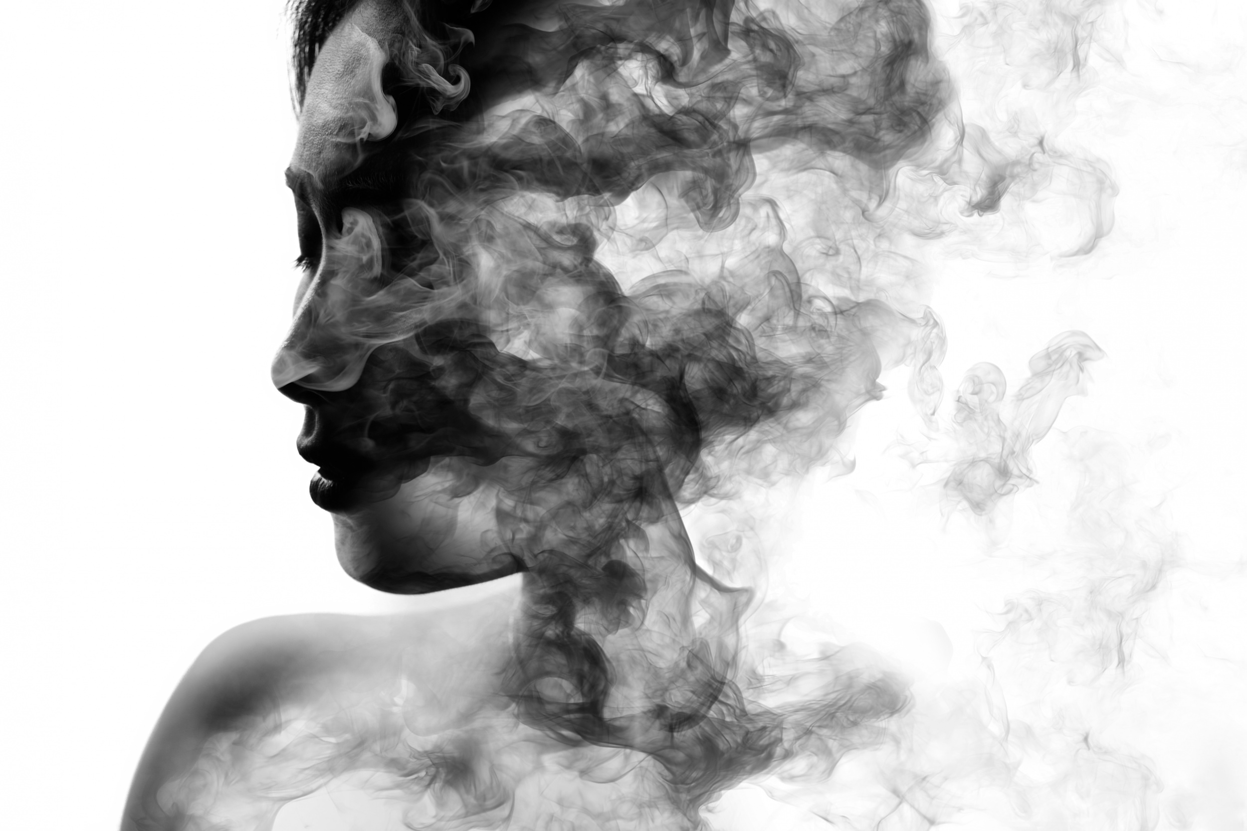 Technical Process: For this work, I used Photoshop brushes made from smoke images, applying them to specific areas of the model to make her appear as if she were dissipating. Layer masks and brushes helped refine the contours, while actual smoke overlays were added in difficult areas to create a seamless integration. Simply drawing smoke shapes can look unnatural, so I used blur filters strategically to maintain depth of field.